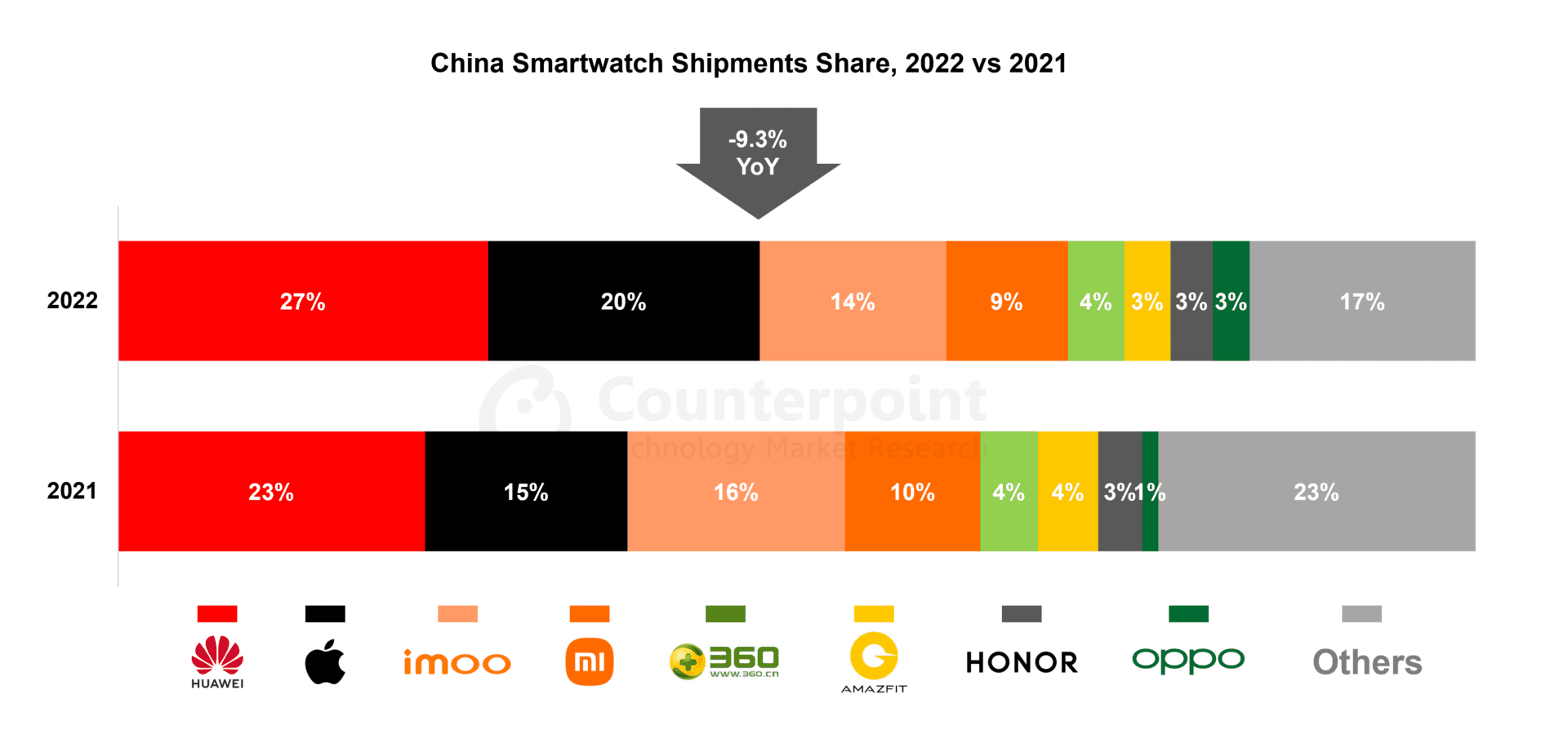 华为在中国消费者中享有良好声誉。在降价的推动下,儿童手表4 Pro在2022年市场畅销榜上排名第一。Watch 3 Pro和GT 3 (46mm)是华为排名前三的另外两款机型。其HLOS智能手表的出货量在2022年翻了一番,以支持华为在2022年实现9%的同比增长。