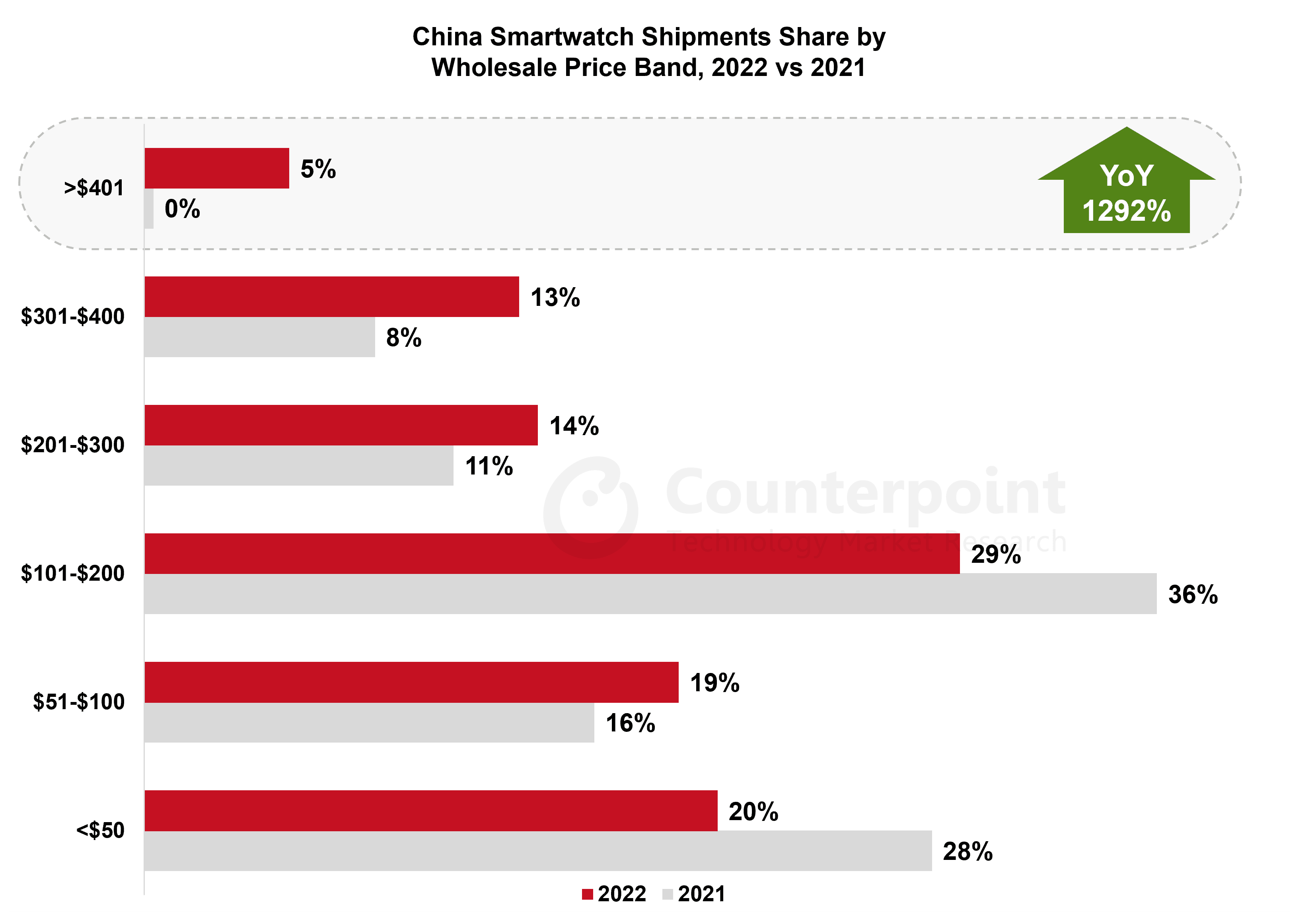 今年最大的亮点是高端市场(200美元)的上涨。301-400美元的出货量同比增长46%;高于401美元的出货量同比增长1292%。低于50美元的细分市场份额下降至20%,出货量同比下降35%。